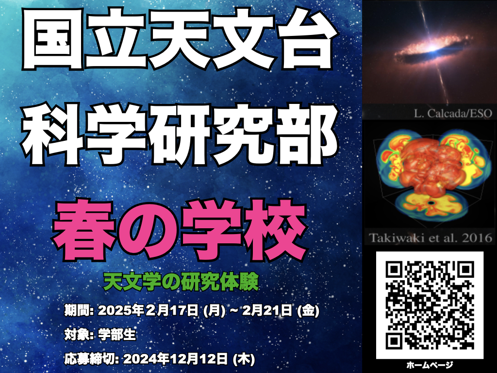 国立天文台科学研究部春の学校は、大学の冬休み期間に開催する学部生向けの研究体験イベントです。 大学院において天文学の研究を検討している大学生を国立天文台三鷹キャンパスに招待し、各コースに分かれて一週間程度の期間で研究体験を行います。 コースは研究テーマごとに分かれており、各コースには数名の教員や大学院生・ポスドク研究員がつきます。